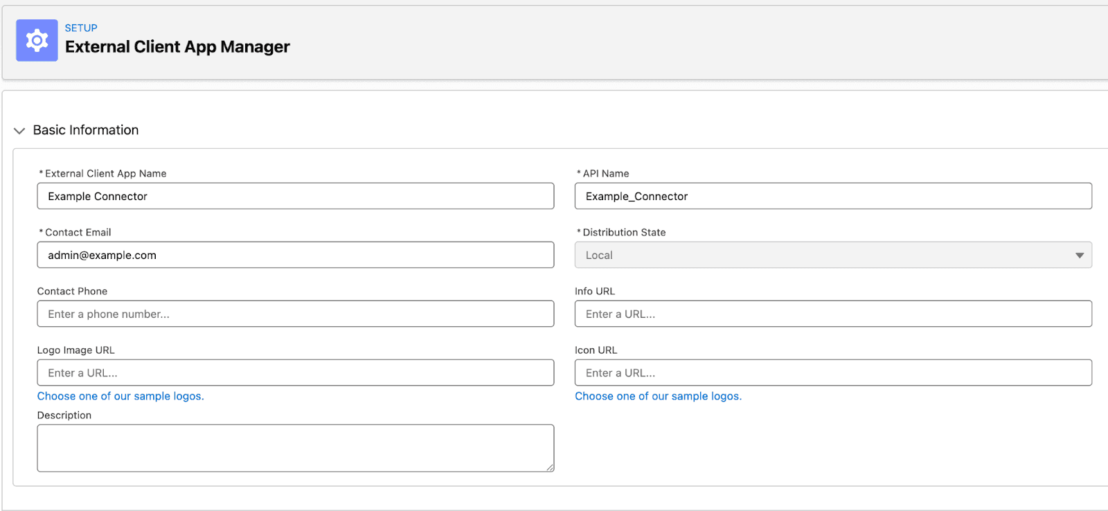 Enter the basic information for your configuration. Since these details are primarily for internal use, you may choose values that best suit your organization; however, we recommend using clear, descriptive names to ensure your team can easily identify the connection. Ensure that you have chosen an unique API Name and that the Distribution State is set as Local.