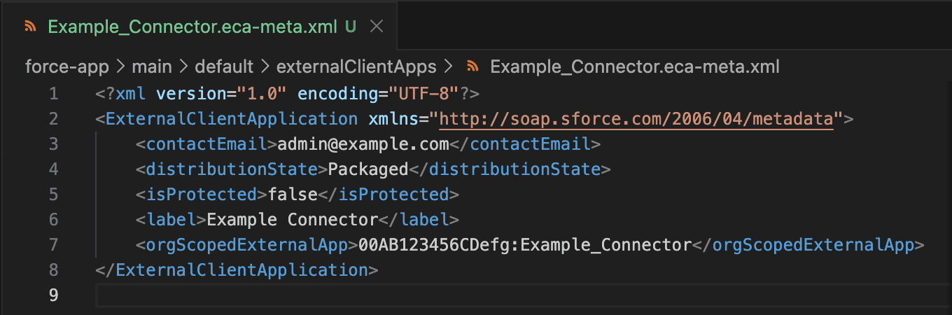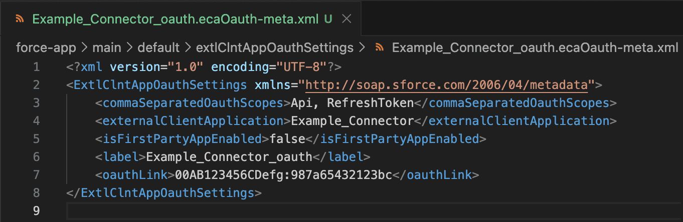 As illustrated, the first file defines the core ECA metadata, while the second manages the OAuth plugin configurations. Take note of the <orgScopedExternalApp> and <oauthLink> fields; both contain a unique ID referencing the Salesforce Developer Hub (Dev Hub) or 'Vendor' org that authored the app. This ID establishes the 'source of truth' for ECA ownership. Furthermore, the <oauthLink> field serves as the functional bridge, linking the OAuth-specific settings back to the primary ECA definition."