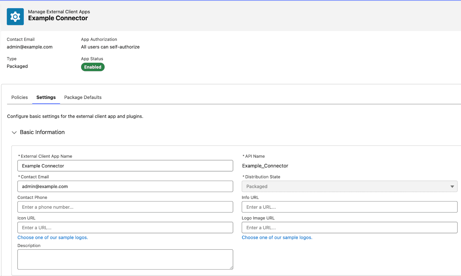 The initial setup for a Vendor-Managed ECA mirrors the Client-Managed process, with exception that we need to configure the Distribution State as Packaged. Using the 'Example Connector', we are no longer just an administrator—we are the Vendor. In this role, we maintain absolute ownership of the configuration and security settings, acting as the sole guardians of the credentials while connecting proprietary services to our customers' environments at scale.