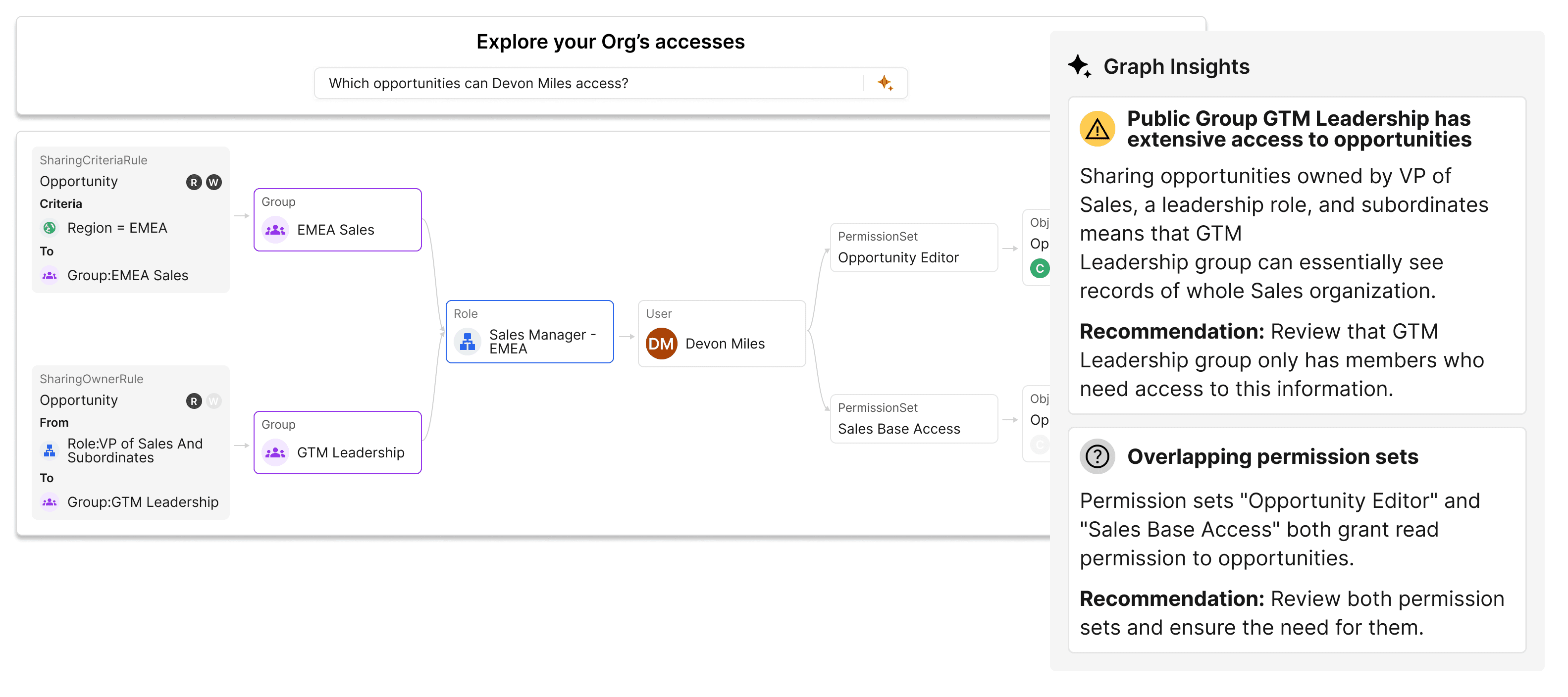 We understand that in Salesforce, complex sharing rules and user profiles can lead to the wrong people seeing sensitive data. It's crucial that only the right individuals access the right information, but understanding precise access, especially in older Salesforce setups, can be incredibly challenging. Valo is building the capability to allow you to intuitively query your access structure—for example, "Who can see the opportunity object?" Valo will then provide a visual map of this access, immediately highlighting any security or data leak risks. This proactive approach helps you enforce the "least privilege" rule, avoid future complications, and keep your Salesforce secure and well-governed.
