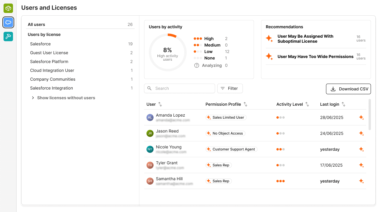 Valo helps you understand exactly how your adoption efforts are going by quickly identifying all your unused and underutilized licenses. This isn't just about saving money; it's a direct indicator of user engagement and potential training gaps. By clearly seeing who isn't fully engaging with Salesforce, you can pinpoint areas for improvement, refine training programs, and ensure users are assigned the correct license types. Valo empowers you to maximize the platform's potential across your organization, driving higher adoption and a stronger return on your Salesforce investment.
