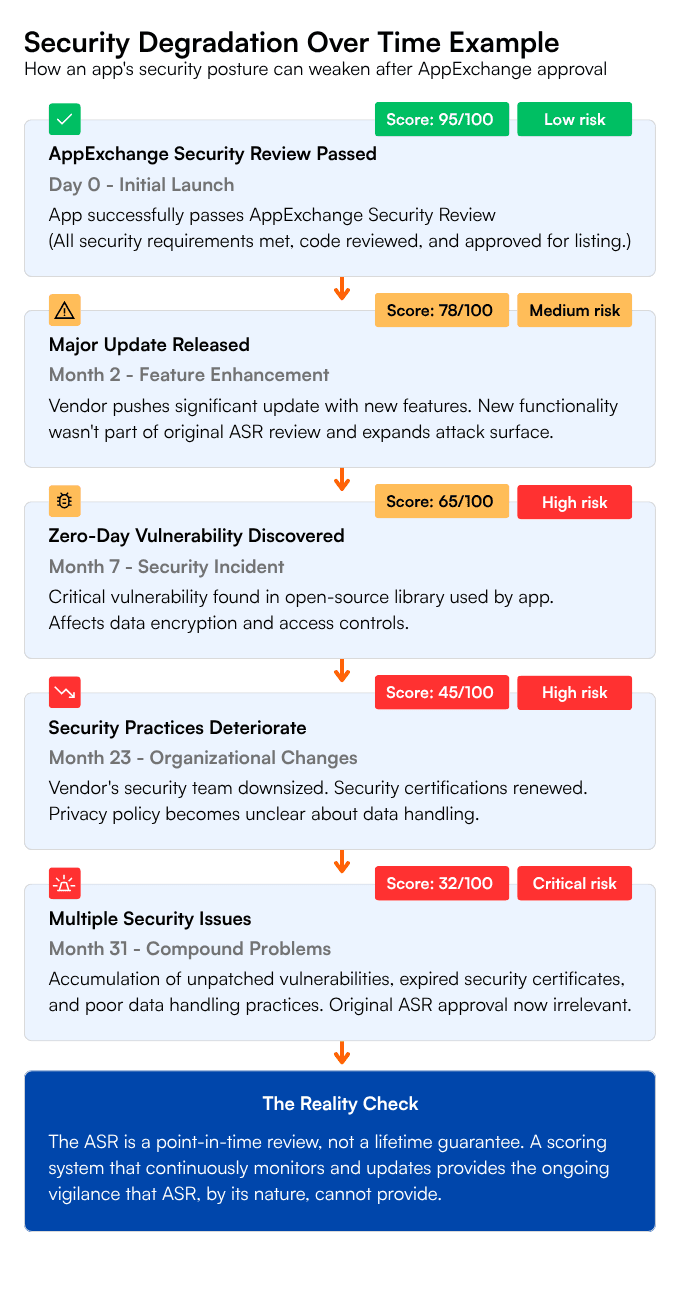 The ASR isn't a continuous, real-time audit. This leads to a false sense of security, where teams assume an app is secure forever simply because it passed the ASR once and is why the "install and forget" mindset is so risky. A scoring system that is continuously updated provides the ongoing vigilance that the ASR, by its nature, cannot.